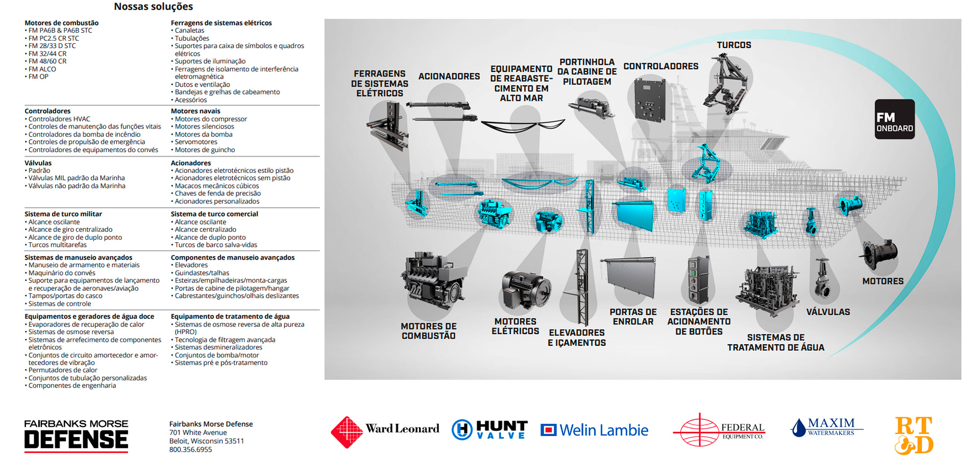 Ao longo dos últimos anos, a FAIRBANKS MORSE DEFENSE realizou uma expansão estratégica, incorporando diversas entidades especializadas no setor naval. Essa integração ampliou significativamente seu portfólio, permitindo que a empresa fornecesse não só motores de propulsão e sistemas de geração de energia, mas também uma gama completa de equipamentos técnicos e de engenharia para navios de guerra, embarcações mercantes e plataformas offshore.